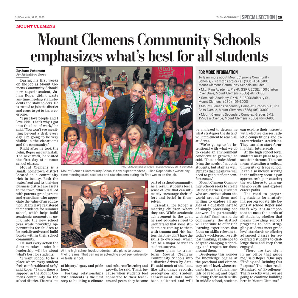 The mission of the Mount Clemens Community Schools is to teach ALL students so that they achieve beyond expectations and meet the challenges of a diverse and rapidly changing world.